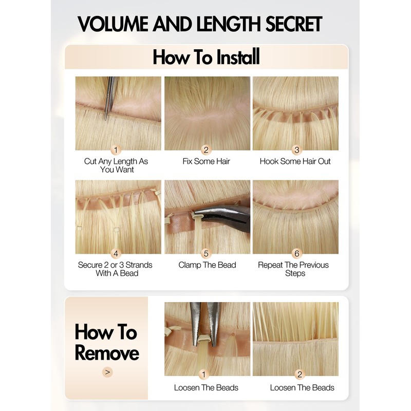 - 【Super Undetectable Hair Extensions】WE CARE YOUR FEELING ON HAIR! Even on a windy day, the beads won't eposed. No one can find volume hair extenions on you! Wear them all day without any irritation. No glue, no clips, no sew in, which means ZERO DAMAGE to your hair. Double-layered PU skin weft (upper hand-tied invisible layer+bottom soft PU layer) lays flat to your scalp, feels light and blends seamlessly with your own hair.