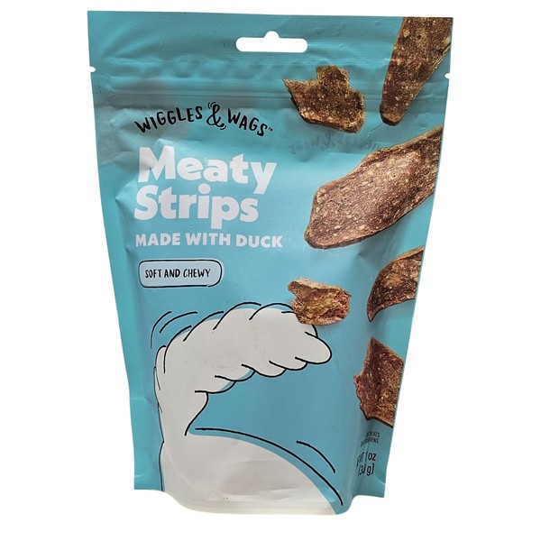 - Wiggles & Wags soft and chew meaty strip duck flavor dog treats, 12 ounce resealable bag.