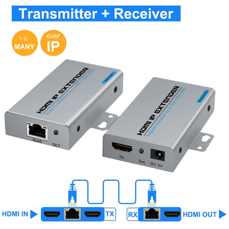 This HDMI Extender can send 1-to-1 signals through single transmitter + receiver, or send 1-to-many signals through an Ethernet switch, and can be expanded to 253 receivers at most.