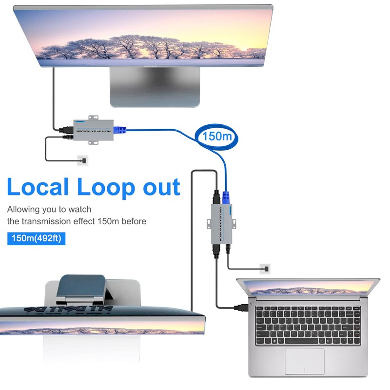 - 【HDMI Extender Over IP】This HDMI extender sends HDMI audio and video signals up to 150 meters through Cat5e/6 network cable. Using Cat5e cable can up to 120m; Using Cat6 cable can up to 150m.
