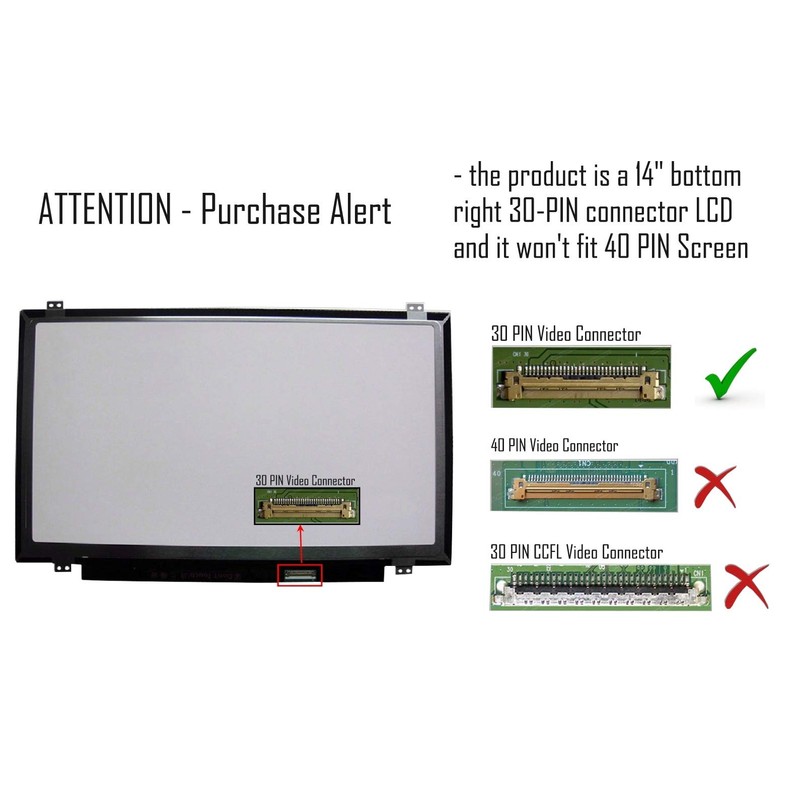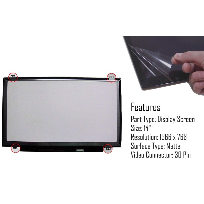 - Screen Size: 14"; Backlight Lamp: LED; Resolution: 1366 X 768 PIXELS (WXGA HD): Screen Finish: Matte; Data Connector: 30 pins (Bottom Right). Please note Touch Panel is not Included.
