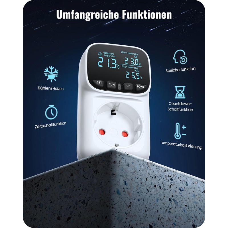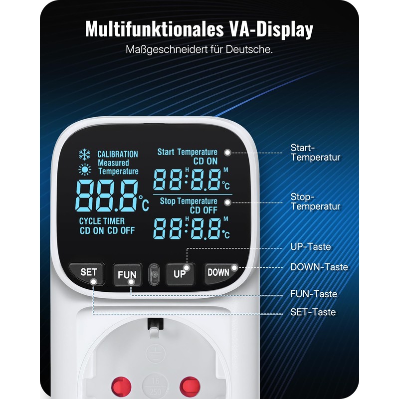 - Functional: Automatic memory function in case of power failure - settings are retained. Temperature difference can be calibrated at the touch of a button. 4 timer modes (cycle, power on, off, on/off delay) cover a wide range of requirements