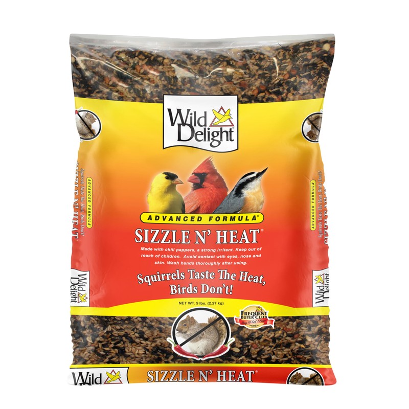 Sizzle N' Heat is premium hot blend wild bird food designed for BIRDS ONLY. It will effectively deter most squirrels.Industry studies show that squirrels are listed as the #1 reason for people leaving the bird feeding category. Squirrels dominate feeders, create a mess and eat much of the seed, nuts, and fruits. After much development and product testing, we created Sizzle N' Heat, a squirrel deterrent product. While this is not a squirrel proof product, our studies showed it to be a very effective squirrel deterrent. While squirrels may still visit and feed at feeders, once they get a taste of the hot seeds, most will look for other sources of food. As with any Wild Delight product, ensuring the best bird feeding experience is the #1 goal. So Sizzle N' Heat is filled with the same highly desired ingredients birds love, with none of the filler ingredients.Made with chili peppers, a strong irritant. Keep out of reach of children. Avoid contact with eyes, nose, and skin. Wash hands thoroughly after using.Primary Attracted Species: Songbirds, Cardinals, Finches, Nuthatches, Jays, Chickadees, Titmice, Grosbeaks and other outdoor pets.Ingredients: Sunflower Kernels, Sunflower Seed, Peanuts, Pistachios, Soybean Oil, Capsicum, Vitamin A Supplement, Vitamin D-3 Supplement, Vitamin E Supplement, Menadione Sodium Bisulfite Complex, Thiamine Mononitrate, Riboflavin, Niacin, Choline Chloride, Vitamin B12 Supplement, Pyridoxine Hydrochloride, Biotin, Folic Acid, Ascorbic Acid (Vitamin C), L-Lysine Monohydrochloride, DL-Methionine, Potassium Chloride, Sodium Bicarbonate, Manganous Oxide, Ferrous Sulfate, Copper Oxide, Calcium Iodate, Zinc Oxide, Magnesium Oxide, Dextrose.