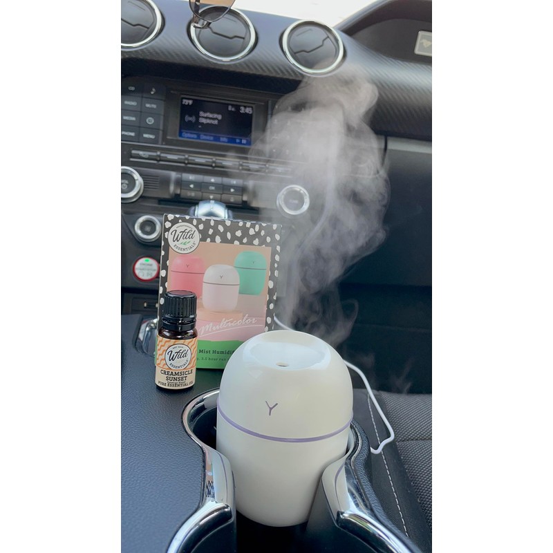 Wild Essentials portable diffusers are the perfect solution to diffuse in a small room, cubicle, desk, car or anywhere else you want to bring your aromatherapy to. Our 220ml (about one cup) diffuser has a light blue finish with a color changing light ring that is a great subtle nightlight. Our mini diffuser has a very quiet (under 25dB) operating cycle and uses a small 3 inch wick for diffusion. The mist selector allows you to select continuous or intermittent spray and has a safety auto shutoff when the unit runs out of water or after 3.5 hours of continued use. Simply add water and a few drops of your favorite scent and let the diffuser do it's thing! Our diffusers are compatible with any essential oil, fragrance or water based scent and are BPA free! Directions For Use: Lift Off Plastic Lid, Remove and Soak Wick For Several Minutes to Saturate Completely, Fill Bottom Up To Fill Line With Water, Add 3-6 Drops of Essential Oil for Diffusion. Replace Lid, Plug Micro USB Cable Into a Power Source, Press Button to Power On.