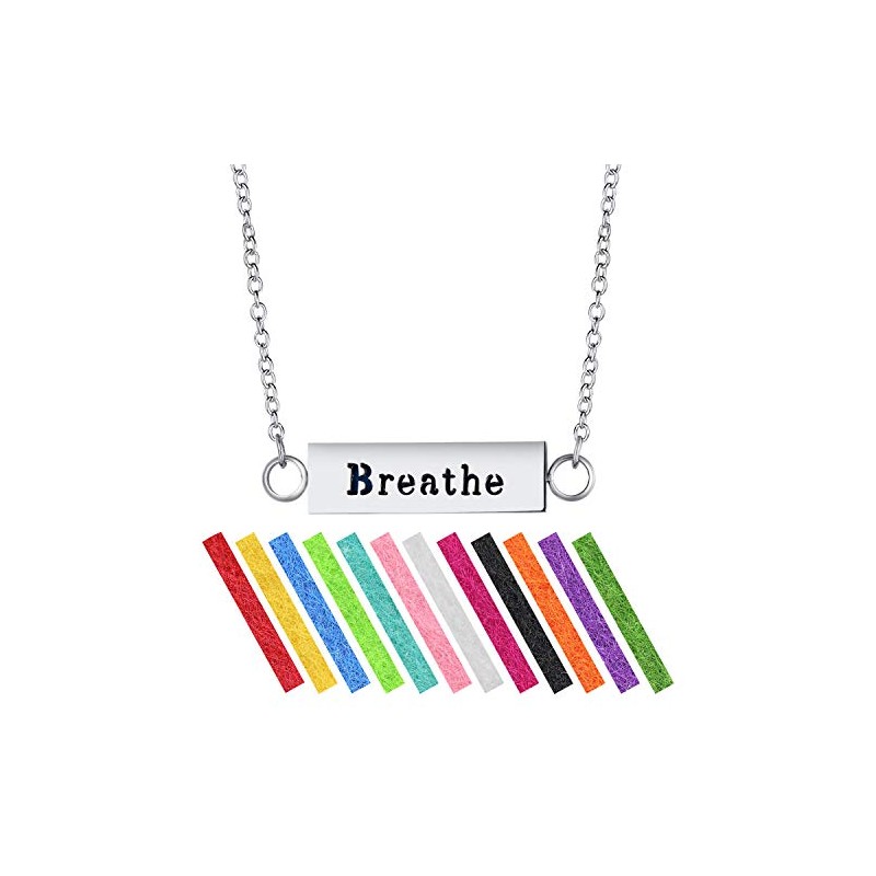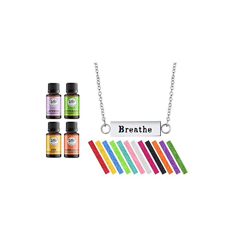 Wild Essentials "Breathe" Essential Oil Diffuser Bar Necklace Gift Set Aromatherapy Pendant, 24" Stainless Steel Chain, 12 Color Refill Pads and Pure Oils: Lavender, Peppermint, Inner Calm, Zen