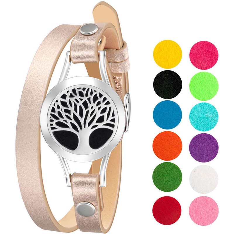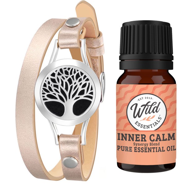 - ESSENTIAL OIL DIFFUSER BRACELET: This Holiday, give the original Tree of Life essential oil bracelet diffuser gift set from Wild Essentials. This ready to use, all in one box set includes everything you need to use it immediately! One 5ml bottles of all natural Inner calm pure and premium essential oil blend, a leather wrap band, a beautiful pendant and 12 different colored 17mm refill pads.