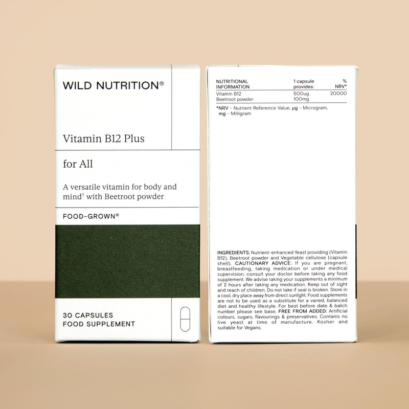 WILD NUTRITION Food-Grown Vitamin B12 Plus | Naturally Sourced B12 Plus Supplement for Psychological Function and Immune System, Great Nutritional Support for Vegan and Vegetarian diets – 30 Capsules