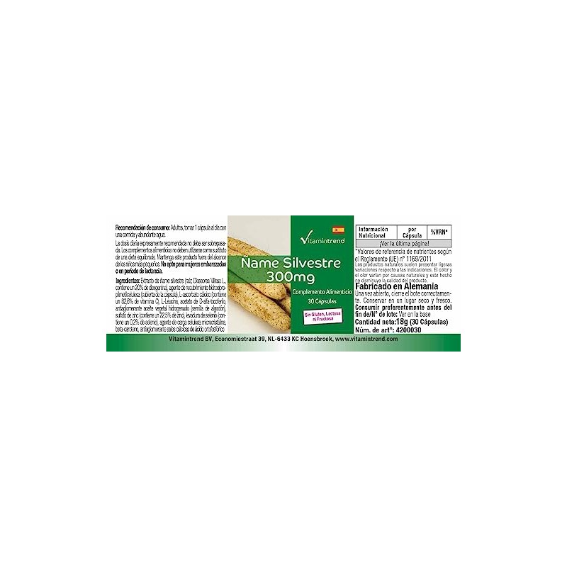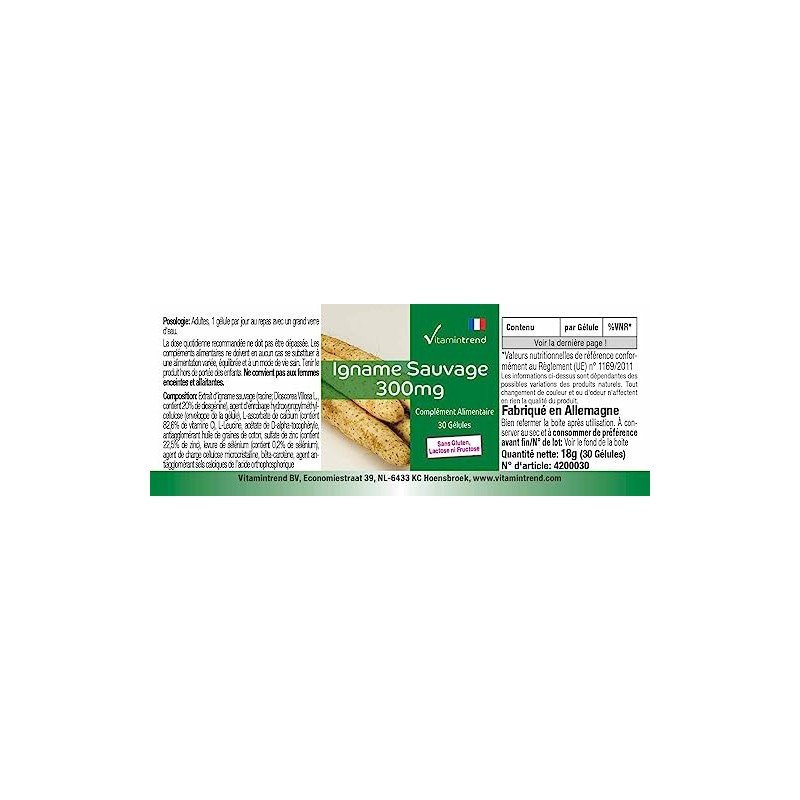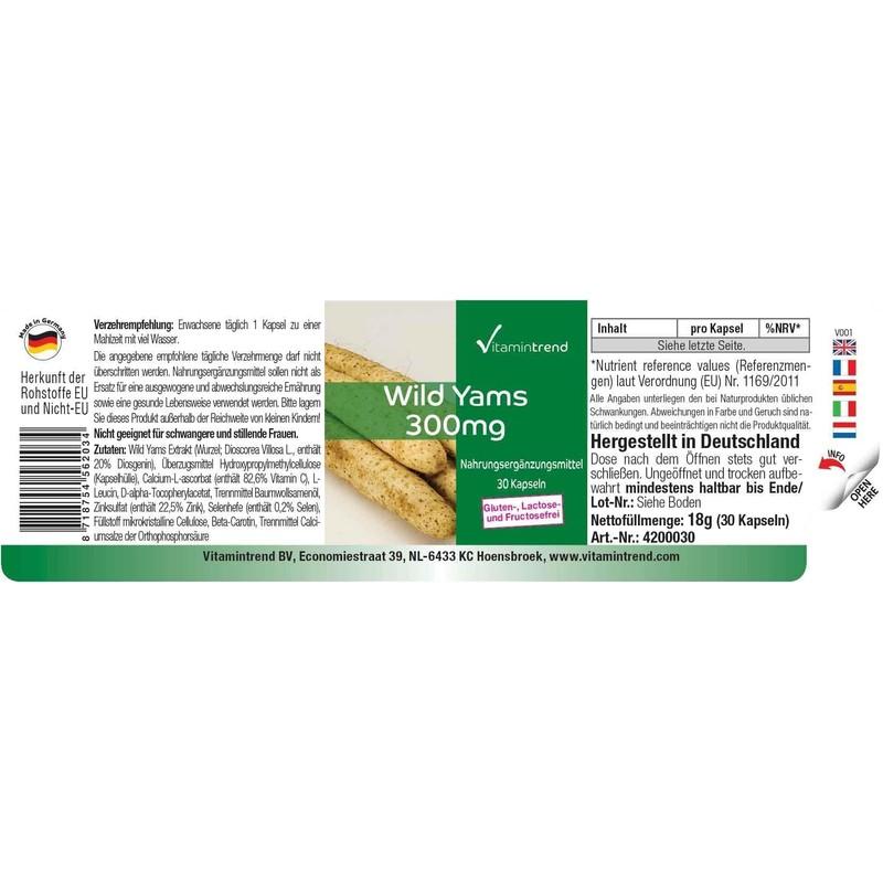 - Vegan and free from: fructose, lactose, gluten, gelatin, soy, magnesium stearate flavours, preservatives, pesticides, fungicides, artificial fertilisers, dyes, stabilisers, GMOs and allergens. Yam root dietary supplement from Vitamintrend with excellent absorption. The yam root extract is standardized to 20% diosgenin.