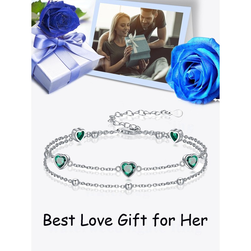 Wildari Birthstone Bracelets for Women 925 Sterling Silver Charm Link Double Strand Heart May Birthstone Jewelry Gift for Wife Women Mother's Day Gift
