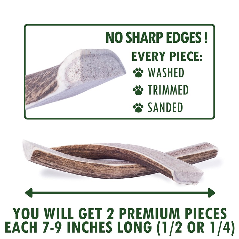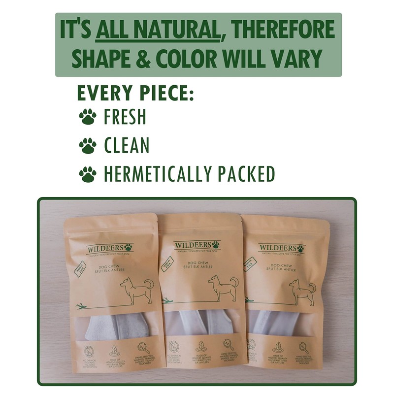 Do you LOVE dogs like we do? If the answer is YES (We hope it is), you should know that we would like to give YOUR PET only PREMIUM QUALITY antler bones for dogs, which are specially selected from Heartland Antlers. Our antlers are big and hard enough for your pet safety. Do you care about nature? Wildeers brand was created by people who care about all livings. During the production process no animals are harmed. Remember, just antlers naturally shed are rich in minerals which are the biggest value of this treat. Buying from us, you can be sure that this product is the highest quality on the market. They help your pet to keep his teeth and mind in awesome condition Since our antlers are never farm raised they do not contain steroids, antibiotics, preservatives or any artificial additives. Be careful with similar products, which are soft toothpicks and can be harmful for your pet. What will you get? Buying from us you will get 2 pieces of 7-9" inches long split elk antler for dogs (depends on selected variation). Please choose right size for your breed and weight. Don't worry when your pet breaks the antler, it is natural. Antlers are very hard but they are not indestructible. Always watch your pet while they enjoy this treat to prevent injury and choking hazard. Some aggressive chewers may be able to chew an antler into small bits, pieces or shards. If this occurs, those pieces and the antler should immediately be discarded. Make your dog happy today - Click the ADD TO CART Button above!