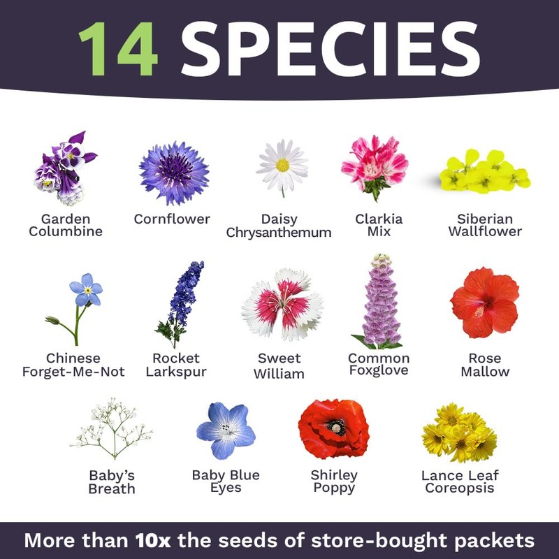 - Contains the following: Common Name (Scientific Name), Garden Columbine (Aquilegia vulgaris), Bachelor's Button (Centaurea cyanus), Siberian Wallflower (Cherianthus allionii), Daisy Chrysanthemum (Chrysanthemum maximum), Clarkia Mix (Clarkia elegans), Lance Leaf Coreopsis (Coreopsis lanceolata), Plains Coreopsis (Coreopsis tinctoria)