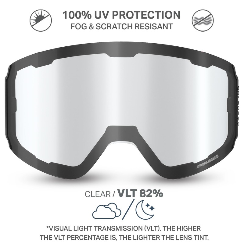 - AURORA LENS TECHNOLOGY: Don't ruin your skiing or snowboarding trip with a sub par lens. Our WIDE VIEW panoramic spherical dual lens design with premium Anti-Fog & Anti-Scratch coating allow you to see the terrain in any light condition without distortion while also protecting your eyes from glare and harmful UV rays