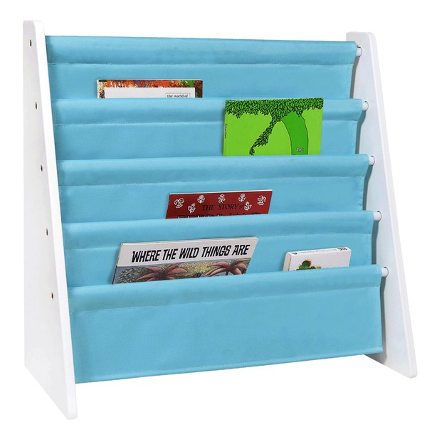 Wildkin Kids Premium Canvas Sling Bookshelf for Boys and Girls, Wooden Design Features Four Fabric Shelves, Keep Bedrooms, Playrooms, and Classrooms Organized, an Ideal Kids Bookshelf (White w/Aqua)