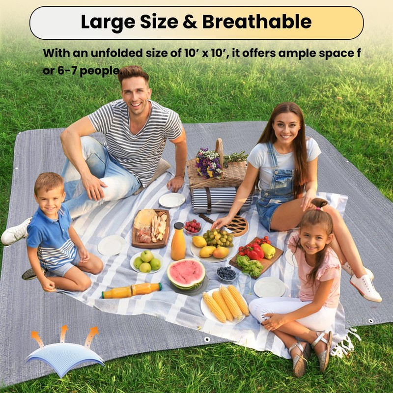 - Large Size & Breathable: The mat unfolds to a size of 10'x10', capable of accommodating 6-7 people comfortably. Crafted with breathable fabric, it allows air and moisture to pass through, ensuring that the grass beneath remains healthy and vibrant even with the mat placed over it