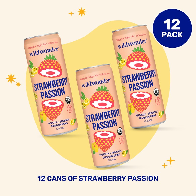 Wildwonder wildwonder Sparkling Probiotic Juice Drink w/Gut Health Immunity, Digestion Support, 5g Fiber, Live Probiotics, Caffeine Free, Organic, Low Sugar, 12pk 12oz, Strawberry Passion, As Seen on Shark Tank