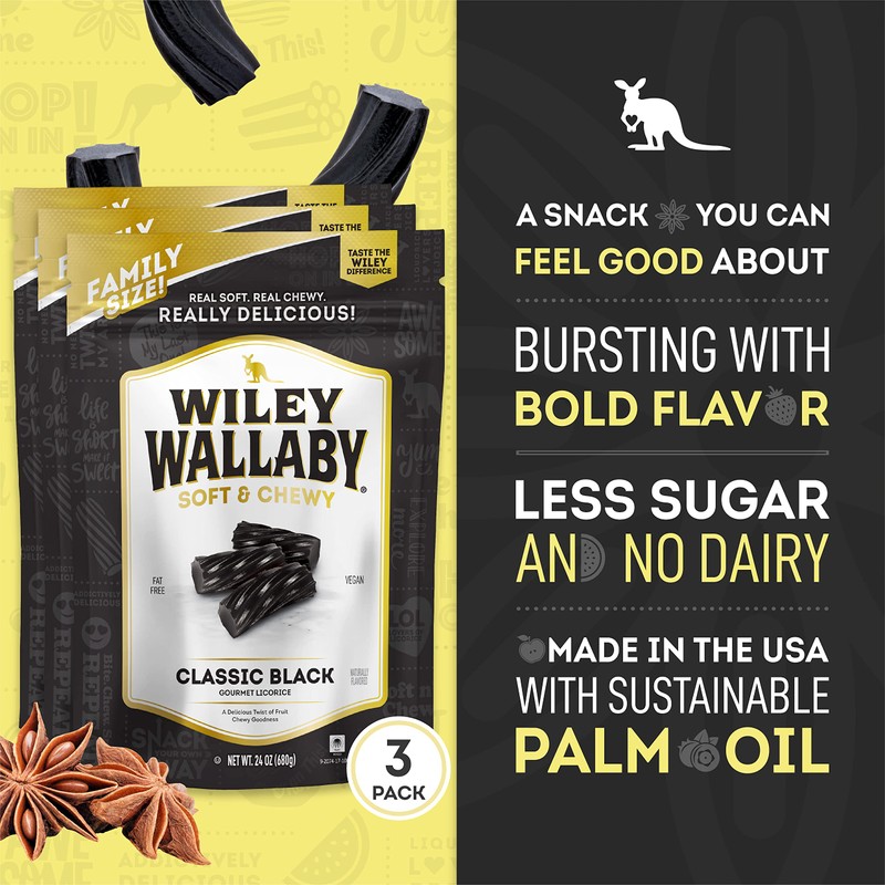 Wiley Wallaby Licorice 24 Ounce Classic Gourmet Soft & Chewy Australian Black Licorice Candy Twists, 3 Pack
