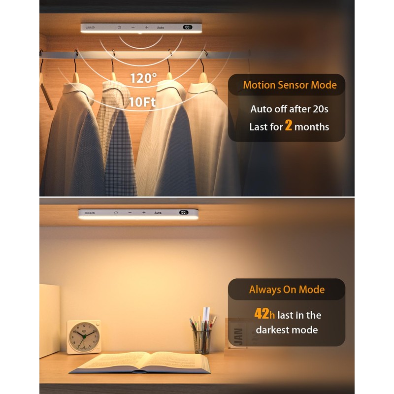 WILLED 3000K Closet Lights Motion Sensored, Battery Display, 60 LED Touch Light Bar, Motion Sensor Light Indoor, Under Cabinet Lights Rechargeable, Stick on Lights for Closet, Kitchen, Hallway, 2 Pack