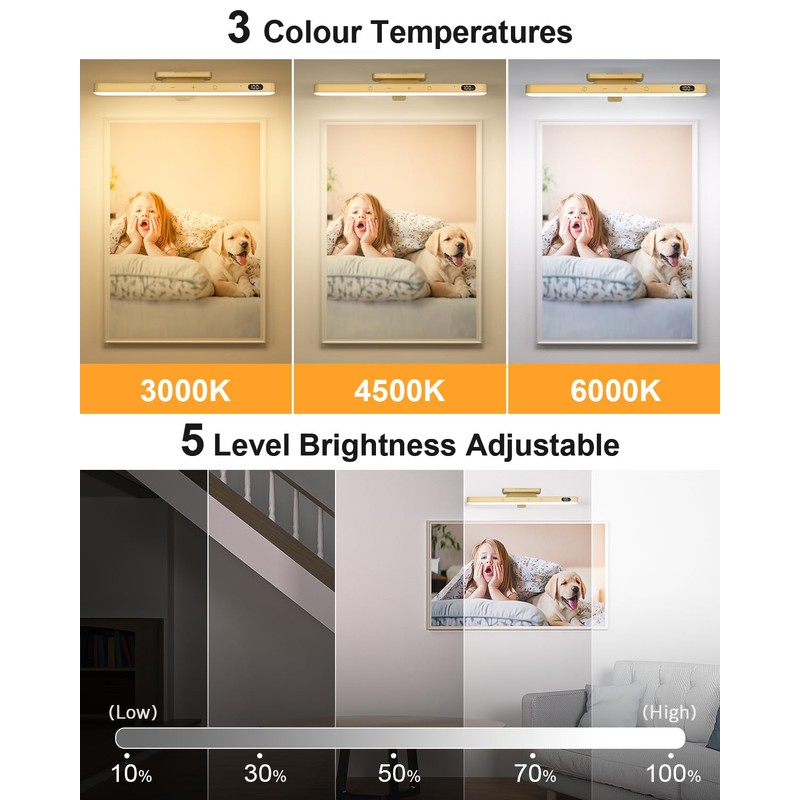 - ??Helligkeit und Farbtemperatur einstellbarDiese picture light verfgt ber 120 hochhelle LED-Perlen und ist damit heller als andere Produkte auf dem Markt. Die bild beleuchtung bietet drei Farbtemperatur-Optionen: Warmwei? (3000K), Neutralwei? (4500K) und Kaltwei? (6000K). Diese Optionen erm?glichen es Ihnen, Ihre Bilder besser hervorzuheben und die perfekte Atmosph?re zu schaffen. Darber hinaus verfgt die led bild ber 5 Helligkeitsstufen, die einfach mit einer Fernbedienung oder durch Berhrung gesteuert werden k?nnen.