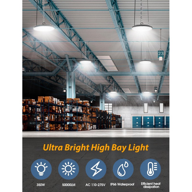 - 【𝟱𝟬𝟬𝟬𝟬𝗟𝗠 𝗨𝗹𝘁𝗿𝗮 𝗕𝗿𝗶𝗴𝗵𝘁】The UFO LED High Bay Light 350W with 50000 output lumens provides ultra-bright light equivalent to 850W MH/HPS and saves up to 85% power. LED shop lights use 300 PCS 2024 latest generation high-quality SMD 2835 LED chips to give you the excellent lighting experience.