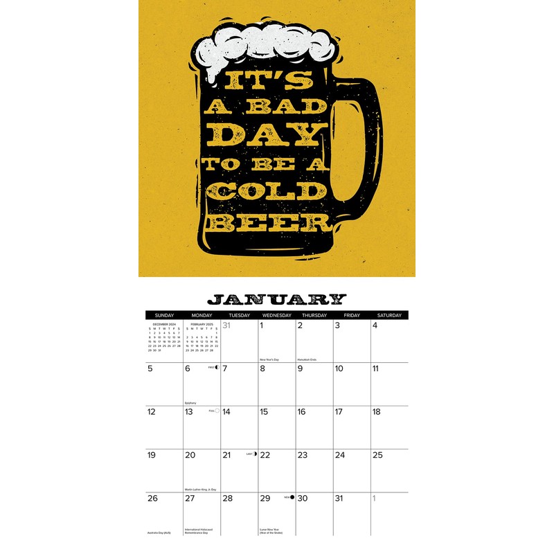 - RAISE A GLASS – Celebrate beer all year round with this calendar. Enjoy full-color images and witty taglines that honor America's favorite beverage, but keep in mind that drinking may cause memory loss, or worse, memory loss.