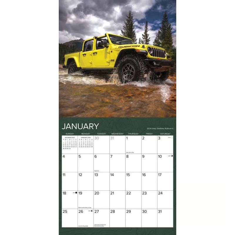 The Jeep 2026 Wall Calendar is an 18-month wall calendar that features full-color photographs of Jeeps in a variety of settings, including off-road environments, rocky paths, scenic byways, diverse terrains, and outdoor landscapes. The calendar depicts activities such as off-road adventure, exploration, Jeeps conquering terrain, and outdoor journeys. Each month includes date grids that start with Sunday, major U.