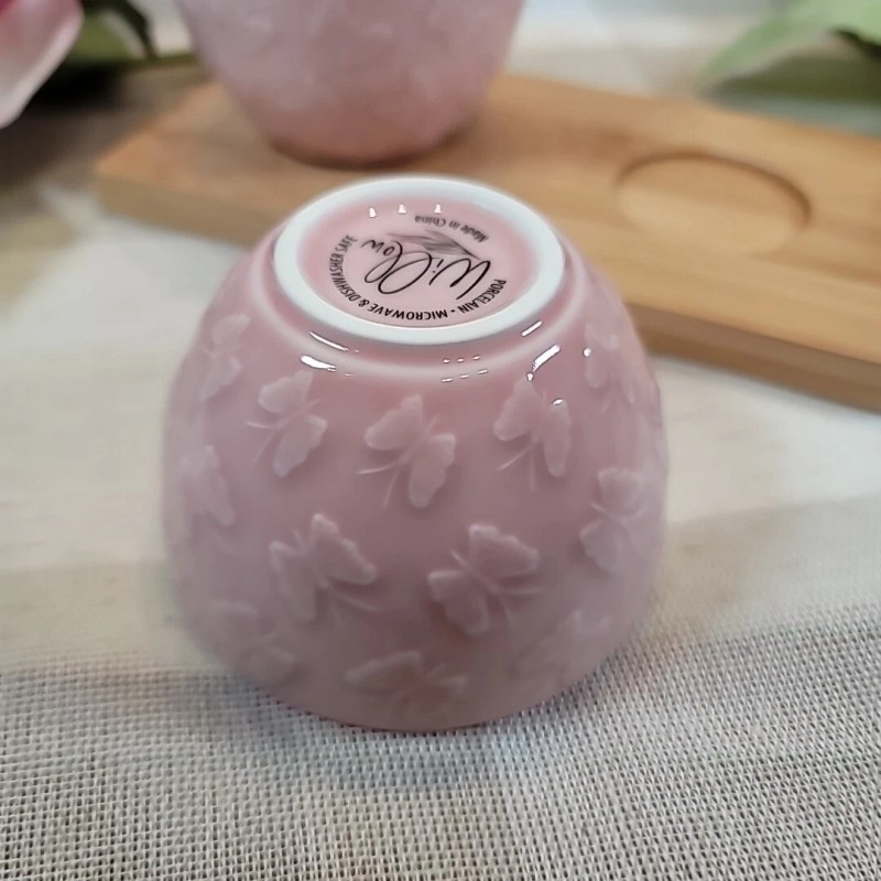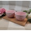 Willow Set of 2 Ceramic Pink Butterfly Desert Soup Dish Bowls Bamboo Tray 3.25"