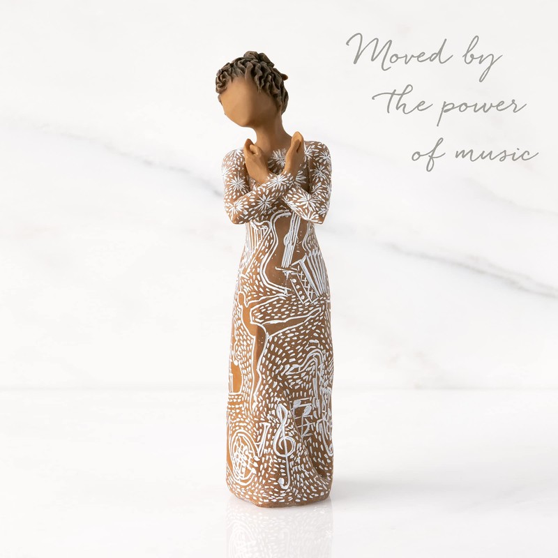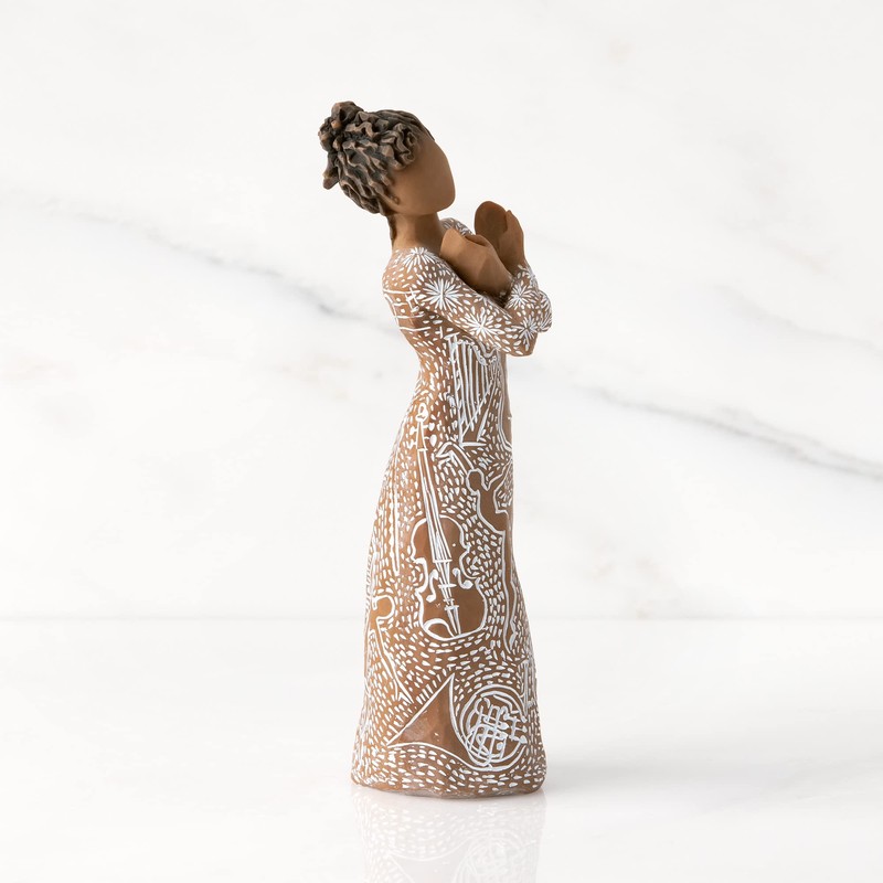 TITLE: Music Speaks (darker skin) SENTIMENT: Moved by the power of music GIFT-GIVING SUGGESTIONS: Darker-skin figure in white dress carved with contrasting pattern of musical instruments and dancing forms. A gift of appreciation for musicians, dancers and those who love the performing arts. Willow Tree carved figures reveal their expression through body gestures only... a tilt of the head, placement of the hands, a turn of the body. Since 1999, American artist Susan Lordi has worked in partnership with DEMDACO to produce, market and distribute Willow Tree, her line of carved figurative sculpture. From her studio in Kansas City, Lordi hand carves the original of each figure. This piece is cast based on Lordi's original and painted by hand. Inside each fitted packaging box is a hang tag with piece title and sentiment on it. Each piece is intended to be open to interpretation from the viewer. "Willow Tree isn't so much about the tangible piece. It represents an emotion or it marks a memory." -Susan Lordi
