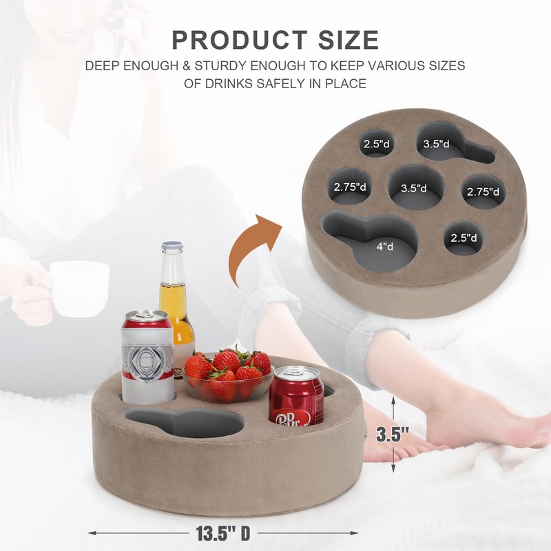 - SOLID CONSTRUCTION: The sofa cup pillow measures 14 ½” D x 4 ½” H with 7 holders console, 2 mug holders, 5 round holders in 3 sizes for wine bottles, cups, cans and more, each cup slot has a plastic bottom that helps keep the drink secure and level.