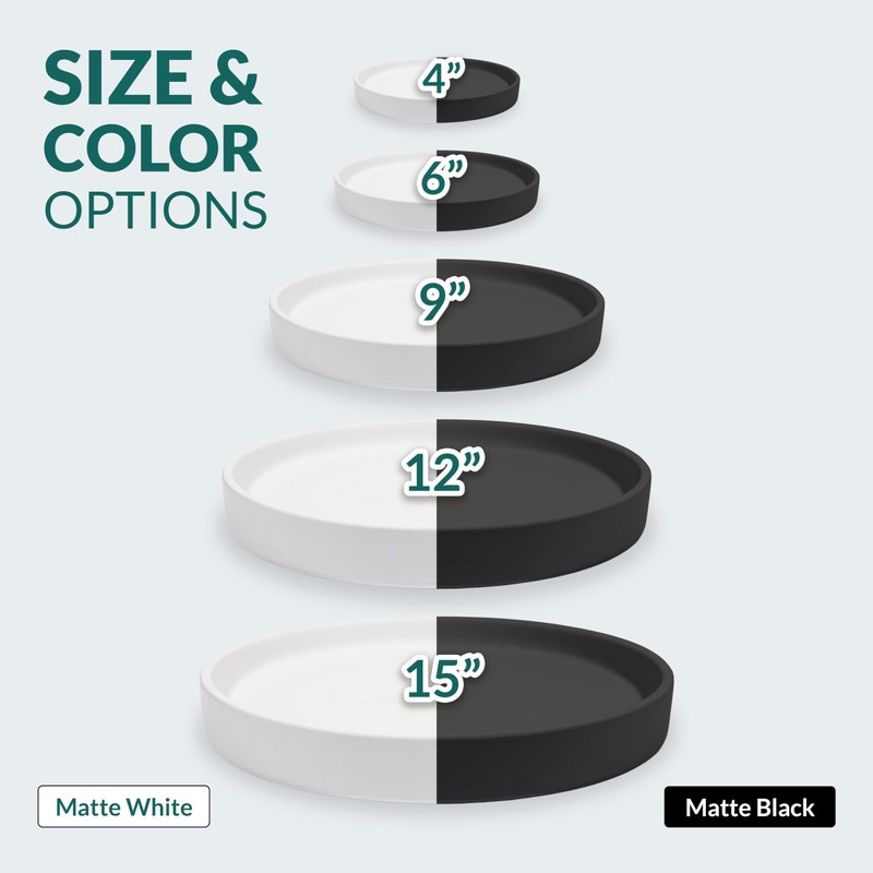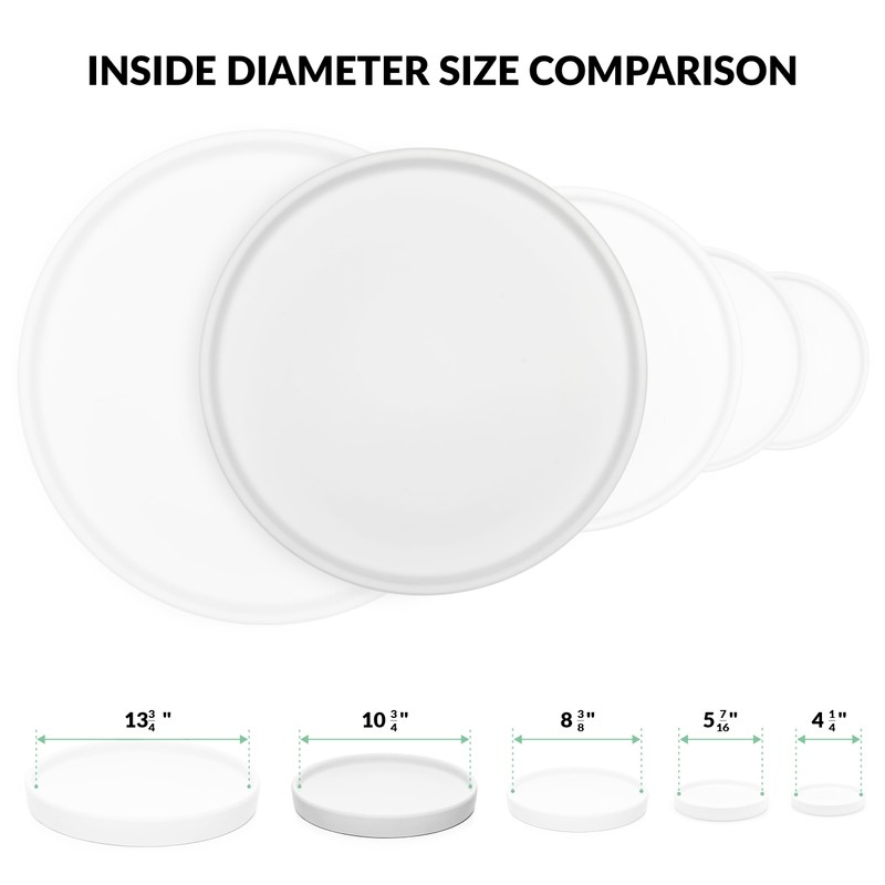 • SIZE: 12 inch matte white plant drainage tray with a 10 ¾" inside diameter measurement.
