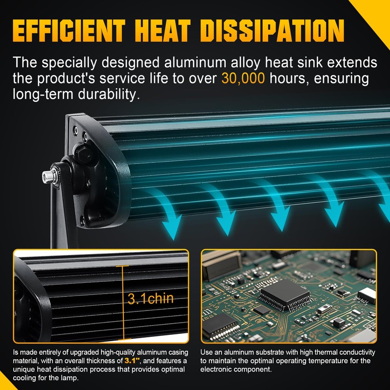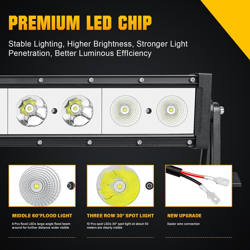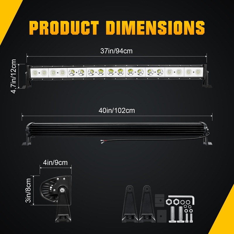 - High brightness: The single-row LED light bar with 90W power output and provides up to 9000LM lumens high brightness. It uses spot flood combo refraction beam technology to get you both a high-intensity spot light for further distance and also a bright flood light at broad distance. Clear all darkness forward and at side roads. A perfect lighting option for offroading trails