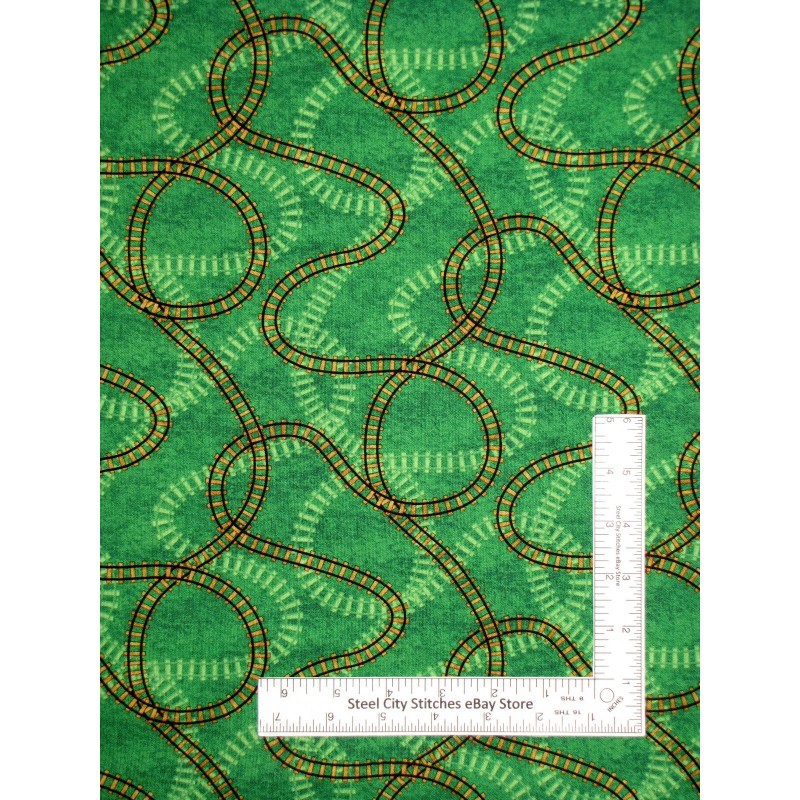 Fabric Description: This cotton novelty fabric with train tracks on a green tonal background.