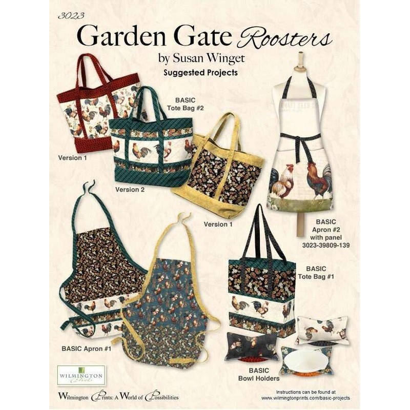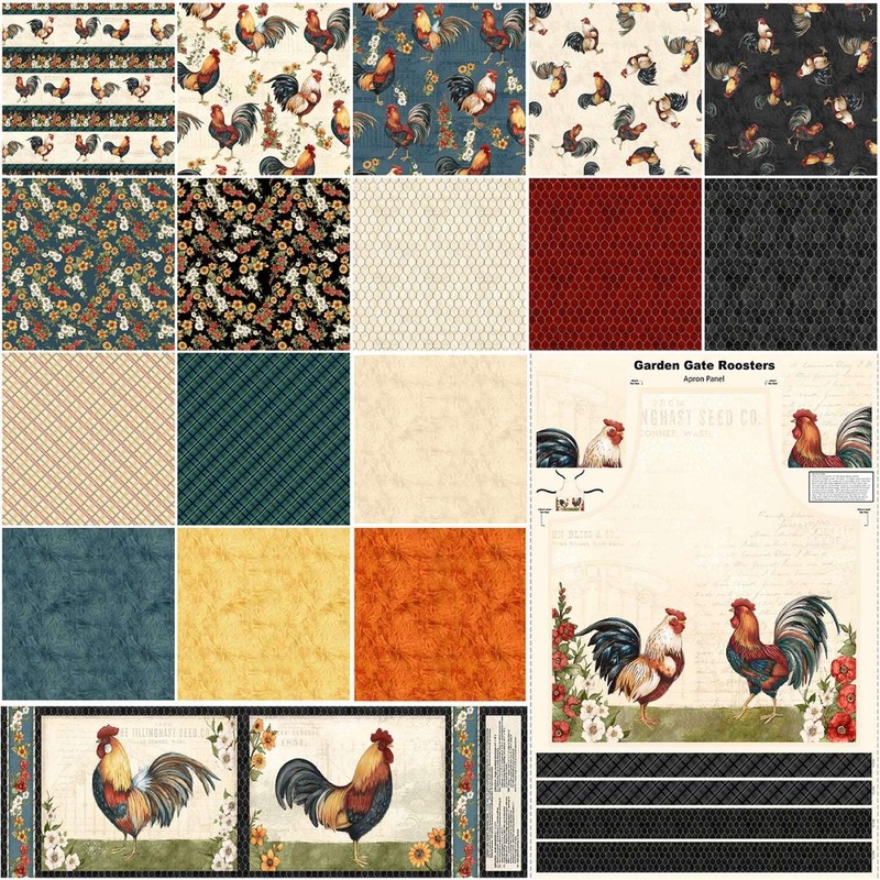 "Garden Gate Roosters" has beautiful rich colors, a somewhat traditional aesthetic, and a very popular theme, especially for kitchens. Designed by Susan Winget, this collection features chicken wire prints, flower motifs, diagonal plaids, and feather textures. The beautiful color scheme include red, cream, yellow, orange, black, and teal.