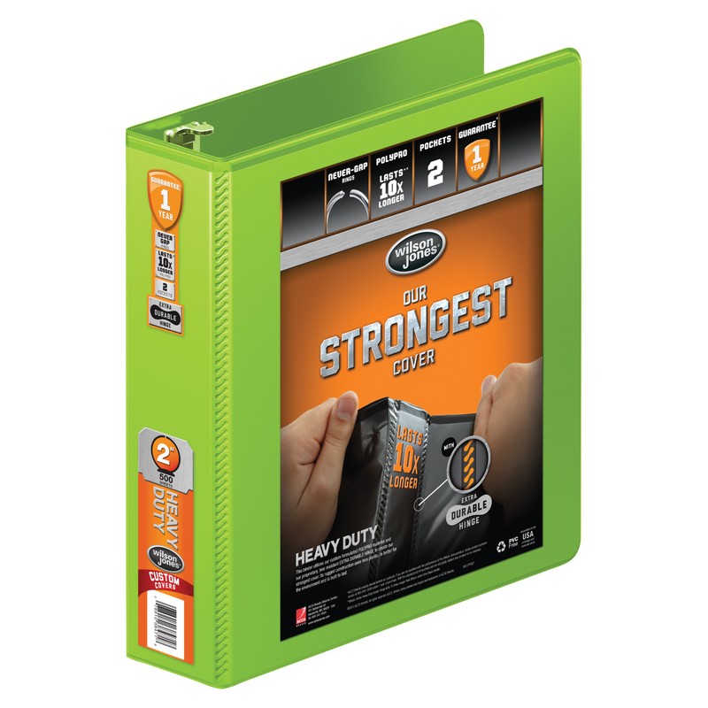 Wilson Jones Heavy Duty View Binders are made from polypropylene, a neutral plastic that is extremely durable. These binders last ten times longer than a comparable binder made of vinyl. Polypro is PVC Free and recyclable. The clear view covers and spine offer endless customization options. Insert colorful cover sheets, custom artwork, comic strips and more.