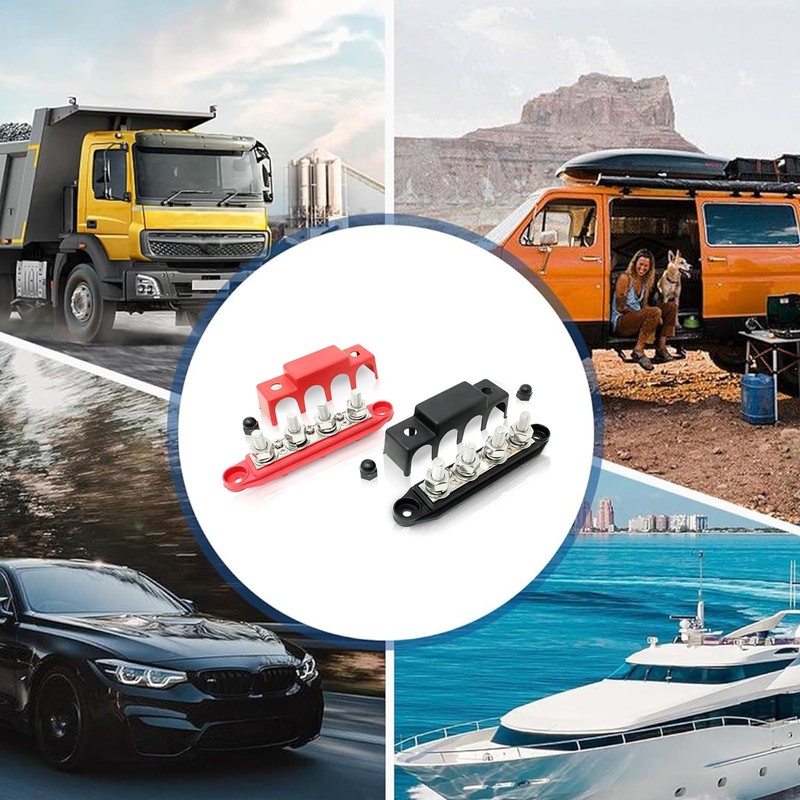 Wilsonzin Pack of 2 250A BusBar Box with 4 x M8 Connection Bolts Busbar Power Distributor 12 V, Connection Bolts M8 for Cars, Caravans, Boats and Yachts (Red + Black)