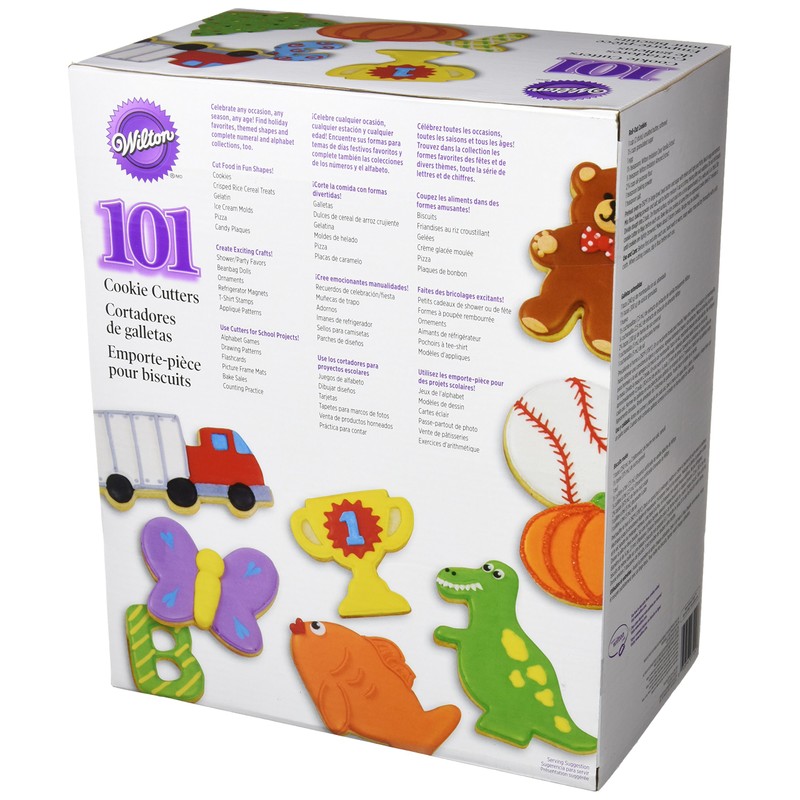 - 101 colorful plastic cookie cutters; average size measures 3-1/2 by 3-1/2 inches