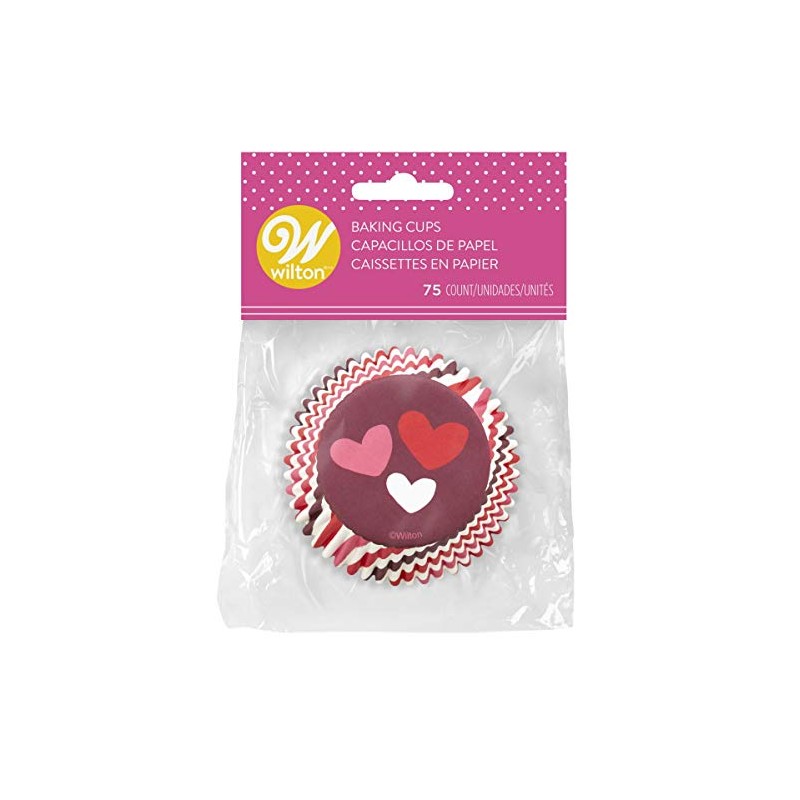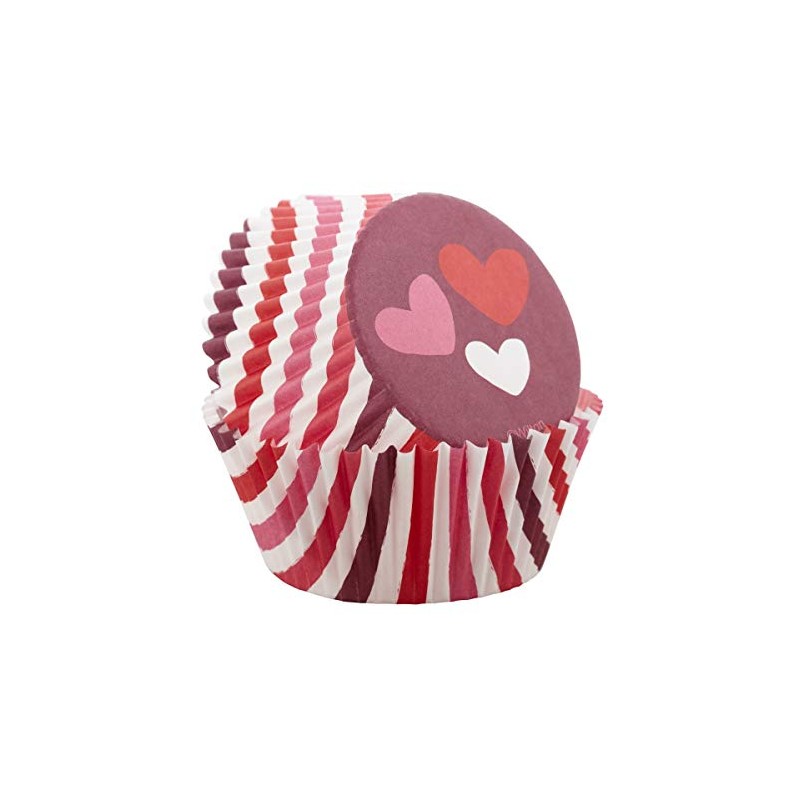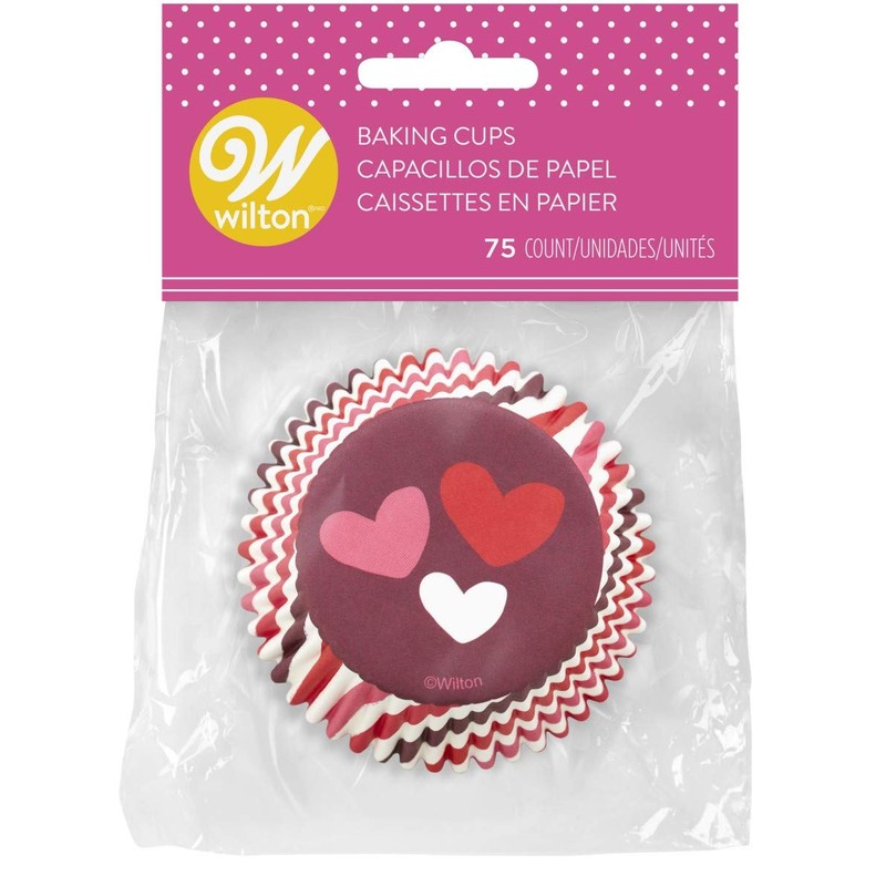 Foil Standard Size Baking cups with Scattered Heart design. 24 cups per package. Modern design in the colors of Red, Pink, and Deep Purple.