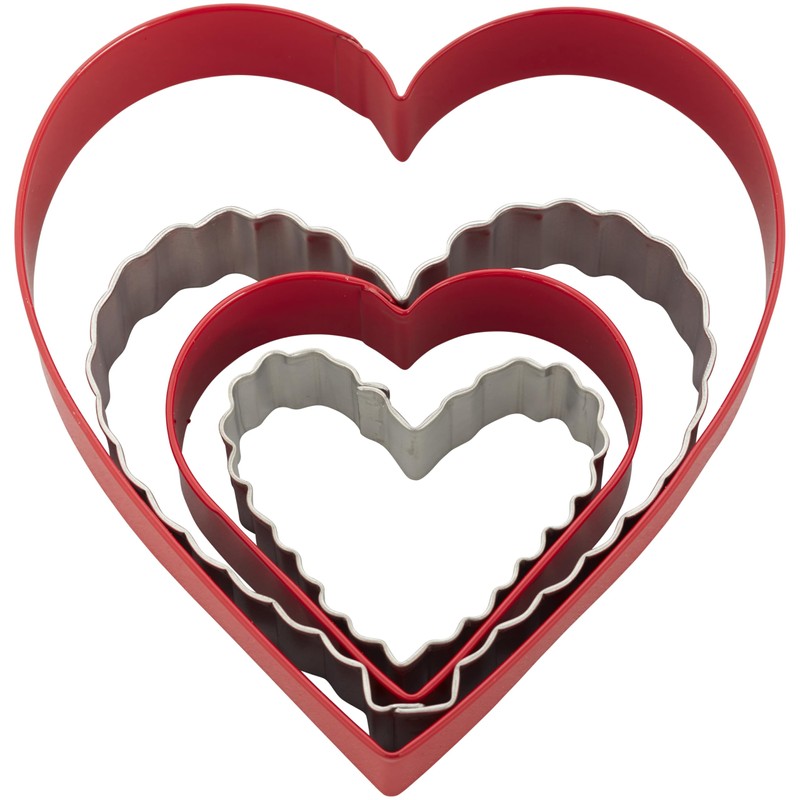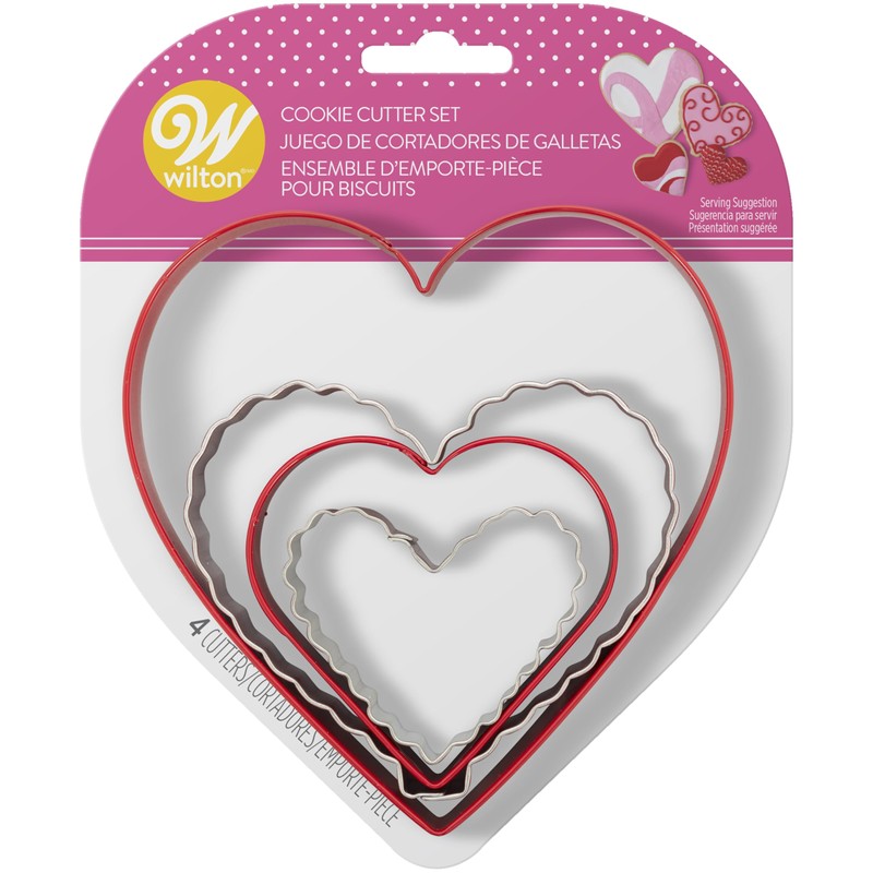 This 4 piece heart cookie cutter set gives you a great variety of sizes and two scalloped shapes. Generous rolled edges and deep sides make these cutters easy to use.