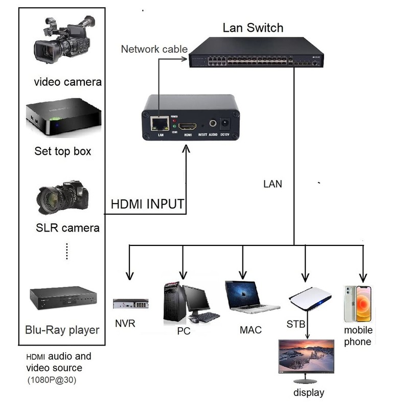 HDMI Video encoder is a device that converts HDMI to ip encoder;It can be used for live broadcast on Facebook YouTube Ustream Wowza and other platforms.The encoder supports IPTV live broadcast and LAN multi-user viewing, UDP,Multicast.support SRT/RTMP/RTSP/RTMPS/UDP/HTTP TS/HTTP FLV/HLS and other network protocol .The resolution Up max to 1080P@30FPS ,Video encoding :H.265/H.264/mjpeg. Audio encoding:AAC/AAC+/AAC++/MP3/MP2/AC3.Support video add time, text, image LOGO and scrolling text.