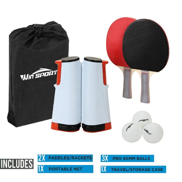 Win SPORTS Table Tennis Paddle Set with Retractable Net,Play Anywhere Ping Pong Net for Any Table,2 Table Tennis Paddle Rackets,3 Ping Pong Balls,Storage Case