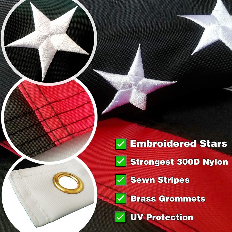 - Quality Materials: The US flag decor of red line, 100% tough and long-lasting Anti-Crease nylon uv material, embroidered stars and stitched stripes, 2 strong brass grommets. Can resist sea-side, highwinds, desert, hail and all weather