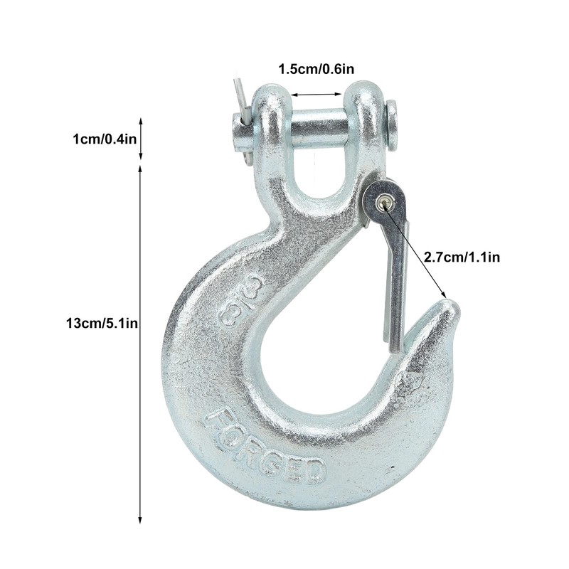 - Spring-loaded safety latch --- The winch hook is equipped with a latch with a fixed pin and a safety latch to easily connect the safety chain from the trailer to the tractor. The high-quality locks greatly ensure the safety chain connection. When the load is loose, the rope, chain and accessories will not separate from the hook
