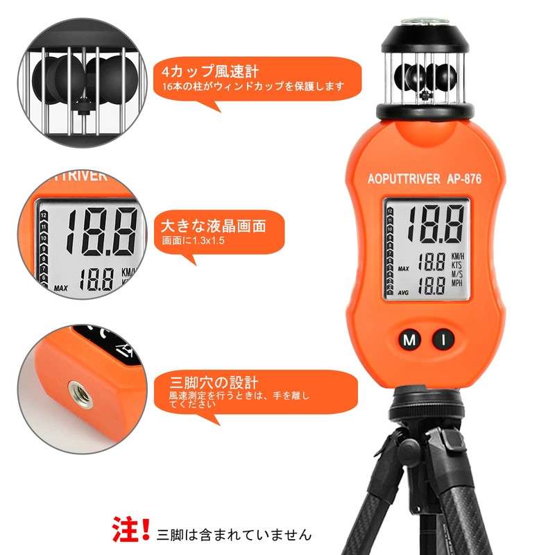 - Functions: Measure wind speed, maximum and average value, select wind speed units (KM/H), KTS, M/S, MPH), automatic shutdown, wind ranks. There is a screw underneath to secure the tripod and is very stable while measuring, but the small tripod is not included
