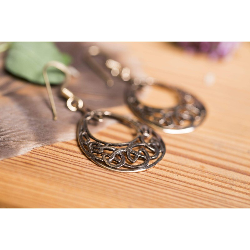 - The ornate earrings are slightly rounded and have very fine Celtic knots