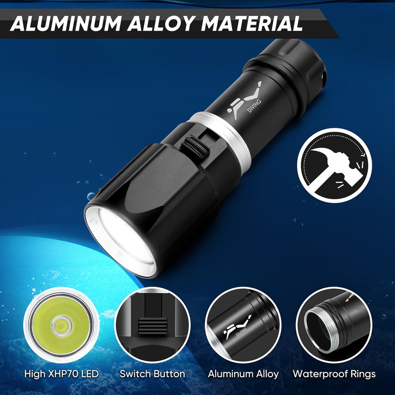- PROFESSIONAL IPX8 WATERPROOF: The underwater flashlight was made of premium aviation aluminum alloy, comes with 3 waterproof O-rings and thickened tempered glass, it is shockproof, scratch-proof, ensuring that the scuba dive light suitable for underwater and outdoor environments.