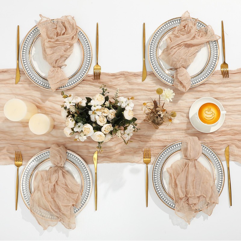 - Elegant Table Runner: made from soft and smooth polyester fiber, these cheesecloth table runners and napkins are lightweight, durable, and designed to maintain their elegance over time; The meticulously sewn edges and gauze texture add a natural, refined touch to any event