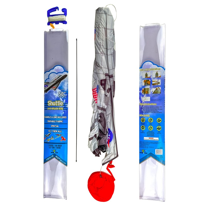 BRS82076 Space Shuttle Kite 46 x 50 inch Kite Brainstorm Kites This is the 46 inch by 50 inch Shuttle 3-D Nylon Kite from Brainstorm Products. Suitable for Ages 8 and Older. Product Features Handle and line included. Rip stop fabric. 3 dimensional. Sky tails and quikclip. Product Specifications Width: 50 inch (1270mm) Wind rated: 7-18 mph (11.3-29kph) Line weight: 25 lbs. (11.34kg) Line length: 170 ft. (51.8m) What is Included One 50 inch Shuttle 3-D Nylon Kite Assembly Required; From the Manufacturer; This Super Size Space Shuttle Kite has wingspan of 50 inches is ready to fly. The 3-dimensional kite is made of durable nylon and has fiberglass airframe.