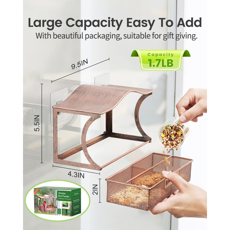- [More attractive to birds]: After many tests, we developed a metal bird feeder that 90% of wild birds like. The near-natural color makes birds approach more trustingly and boldly to eat seeds; our window bird feeder is one-piece, no assembly is required, and it is very easy and fast to use.