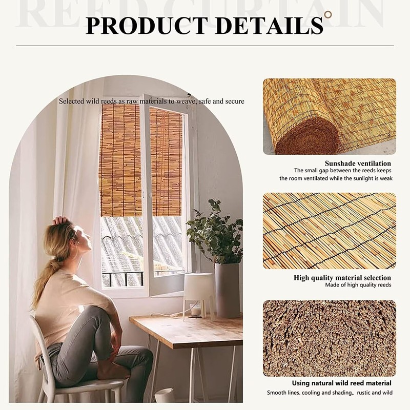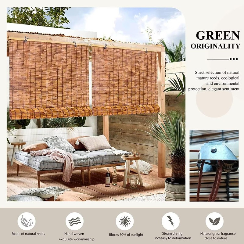 • Reed Shades: Our premium roller shades are made from high-quality natural wild reeds. They block up to 70% of sunlight, creating a cozy atmosphere while preserving outdoor views. Suitable for indoor and outdoor settings, these shades offer rustic charm and durability, ensuring long-lasting use across seasons. These window shades uniform wiring and tight weave enhance both functionality and aesthetics, effortlessly complementing various decor styles.