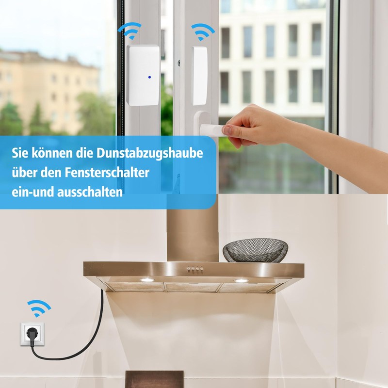 - Make life easier: with the ZAKVOP window contact switch cooker hood, you can activate the ventilation of your cooker hood easily and conveniently by simply opening your window. High range up to almost 30 meters indoors, up to 200 meters outdoors (without obstacles). The exhaust control is 16 A, can be used under 100-240 V voltage, suitable for a maximum of 3840 W electrical devices