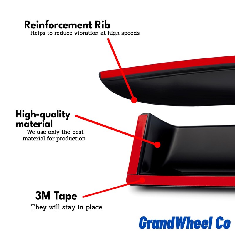 The Original GrandWheel window visors are manufactured with the polycarbonate. Other use acrylic material that cannot be same flexible and durable like polycarbonate. The GrandWheel window visors are engineered by using cutting-edge technology to reduce noise, deflect rain whilst and keep cabin cooled. The 4-piece set comes with easy to install 3M tape and installation manual. Specifications: - Condition: 100% Brand New; - Fitment: Compatible with Ford Focus 2012-2018 Hatchback. - Package includes: 4 pcs window visor deflectors (2 front/2 rear), prep pad, installation manual; - Color: Smoked black tinted; - Material: High quality polycarbonate. Features: - Fresh air even while raining; - Reduces sun glare; - Easy installation; No-drilling required; - Visors are secured with 3M tape; - Custom fit.
